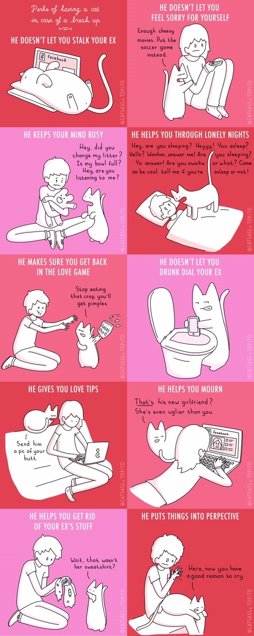 E agora, fora de brincadeiras, a verdade é que ajudam mesmo. Lembro-me de, quando fiquei sozinha, o meu pai me ter dito em relação às gatas: «Lembra-te de que tens aqui duas vidas pelas quais és responsável.» E isso agarrou-me bem à realidade. Muito mesmo.