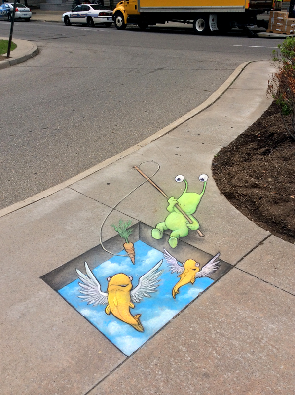 A street art deixou há muito de ser uma novidade, apesar de ser algo de que continuo a gostar. Mas não conhecia o seu lado «fofinho». Ei-lo, pelas mãos de David Zinn e dos seus emblemáticos sapo, porco com asas e ratinhos, entre outras personagens.